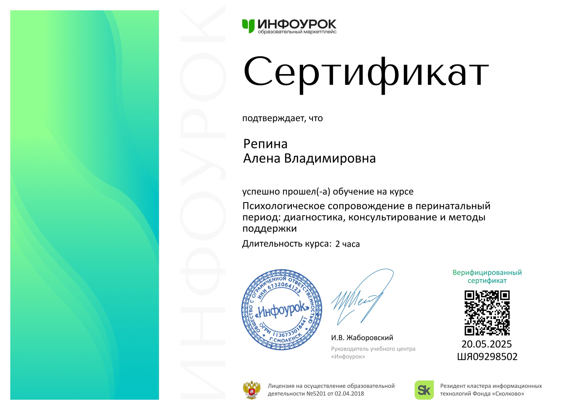 В перинатальной психологии я помогаю будущим и молодым родителям справляться с эмоциональными и психологическими трудностями, страхами, связанными с беременностью, родами, послеродовым периодом и первыми годами жизни ребенка. Я помогаю наладить связь между родителями и ребенком, справиться с послеродовой депрессией и тревогой. Моя цель – создать благоприятную психологическую атмосферу для формирования здоровых отношений между родителями и ребенком с самого начала.